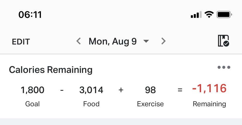 All in all, not a bad day. I was 1,116 calories over my daily allowance but nothing unusual for a Monday. Its my day off exercise so this does happen. I can usually make up the deficit throughout the week.
