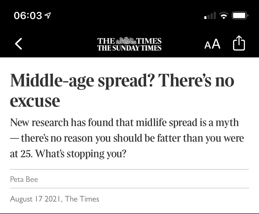 In fact, a study of 6,500 people showed that the impact of metabolism didn’t present itself until the over 60’s. One of the authors summed it up as ‘further proof that ‘midlife spread is not a matter of biology but of behavior’. They went onto say that ‘ there is no biological reason why you should gain pounds as you age’